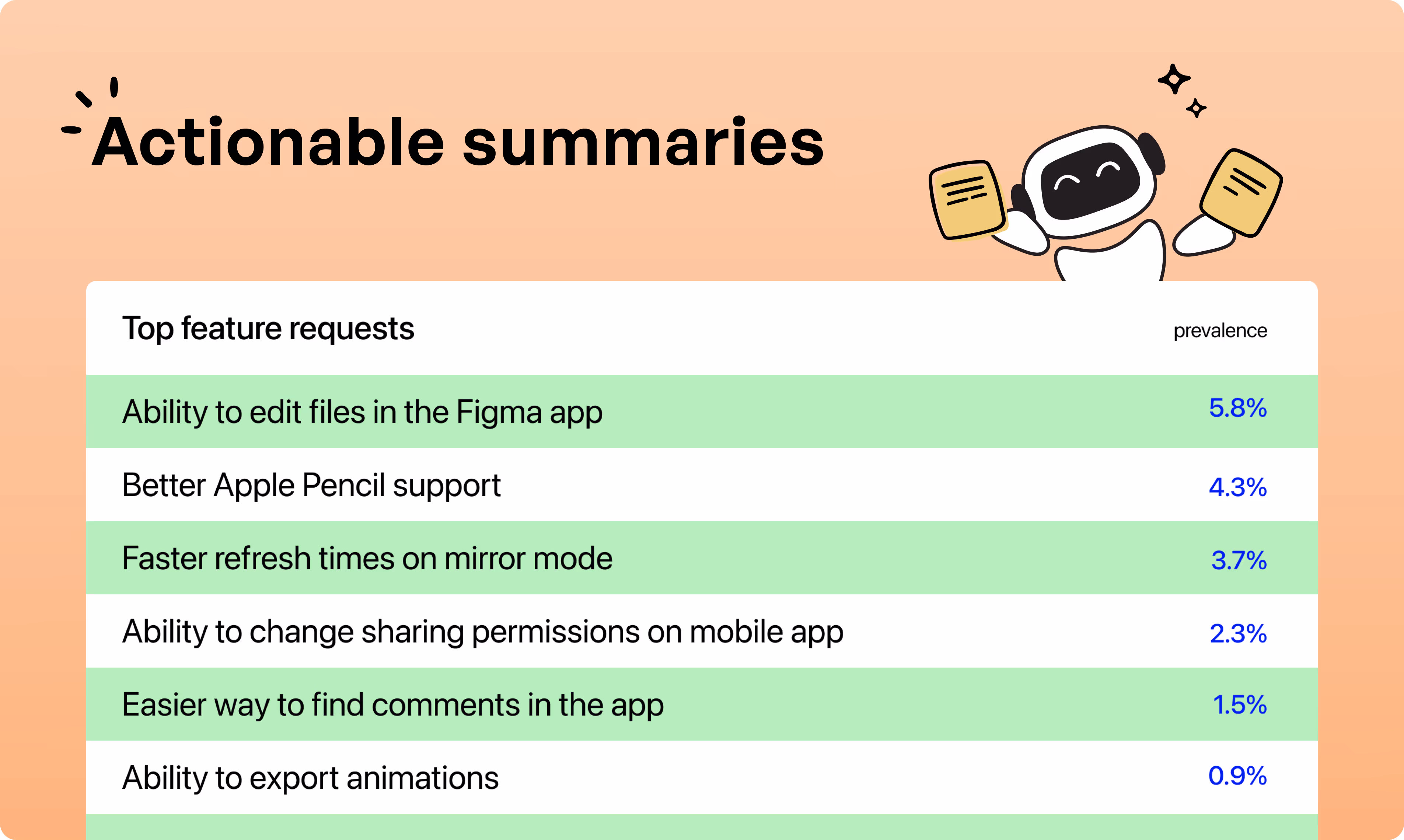 Once you’ve connected your app store reviews, support tickets, or imported some text that you want to analyze, you’ll also get instant summaries of frequent feature requests, common complaints, most loved app features, and lists of competitors. Sorta like instant coffee, only you’ll want to keep drinking it!